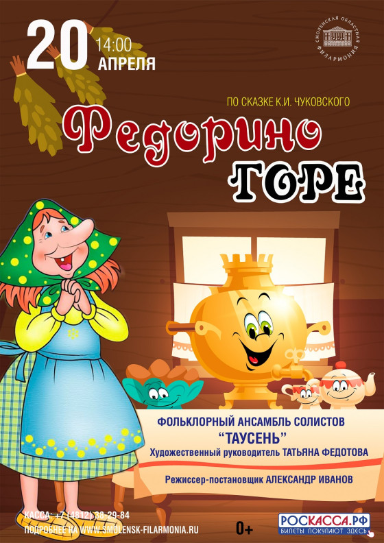 Смоленская областная филармония приглашает юных зрителей и их родителей 20 апреля в 14.00 на детскую музыкальную программу по сказке К.И. Чуковского «Федорино горе» в исполнении фольклорного ансамбля солистов «Таусень».